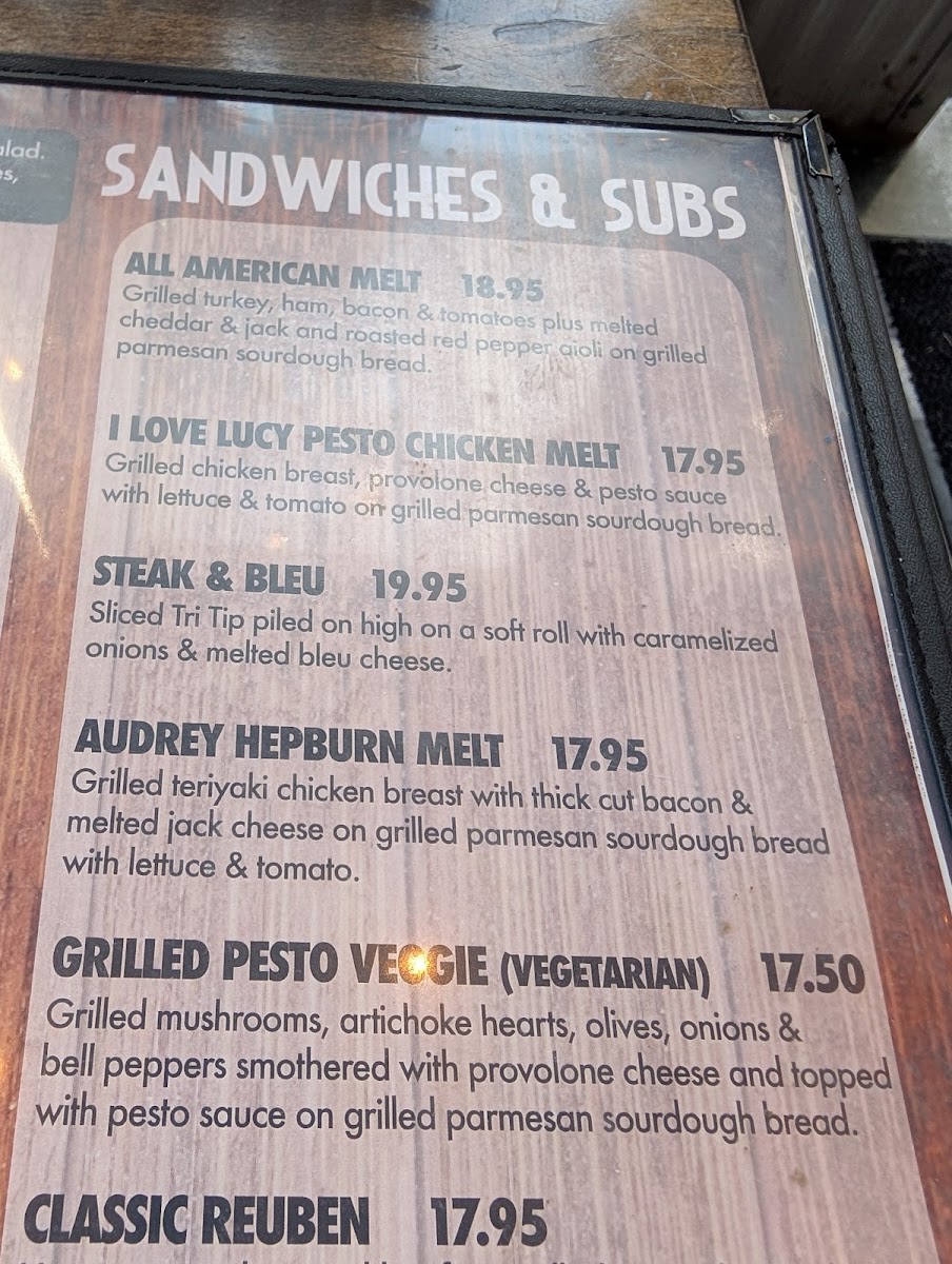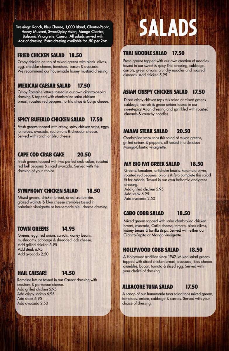 A Hollywood tradition since 1942. Mixed salad greens topped with diced chicken breast, avocado, Bleu cheese crumbles, bacon, tomato & sliced egg. Served with your choice of dressing.